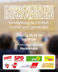 Am Sonntag, den 1. März 2026, setzt Hockenheim ein Zeichen für die Demokratie. Ein breites gesellschaftliches Bündnis lädt um 14:00 Uhr zur Kundgebung auf den Zehntscheunenplatz ein.