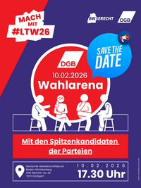 Der DGB Baden-Württemberg veranstaltet am 10. Februar um 17:30 Uhr eine Wahlarena im Gewerkschaftshaus Stuttgart. Die Spitzenkandidaten der demokratischen Parteien stellen sich in einer moderierten Runde Fragen zu Arbeits- und Sozialpolitik.