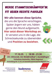 Hier geht es darum sich fit gegen rechte Parolen zu machen: Am 17.10. ist der Stammtischkämpfer*innen Workshop in der Allmende.