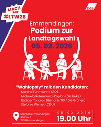 Gemeinsam mit den Landtags-Kandidat:innen im Wahlkreis Emmendingen wollen wir über gewerkachaftliche Themen sprechen. Anstatt einer gewohnten Podiumsdiskussion werden die Kandidierenden am 5. Februar in einem „Wahlopoly“ durch den Abend geführt. Angelehnt an das bekannte Spiel Monopoly bestimmt das Würfelglück, welche Fragen den Kandidierenden gestellt werden. Vorgegeben sind die Kategorien „Gute Arbeit“, „Soziale Sicherheit“ und „Starke Wirtschaft“, die jeweils aus Unterkategorien wie etwa Rente oder Wohnen bestehen. Auch Ereigniskarten und weitere gewohnte Elemente des Spiels lockern den Abend auf.