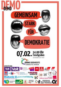 Bei der Kundgebung wird es Redebeiträge aus Zivilgesellschaft und Politik geben. Die Veranstaltung versteht sich als überparteilicher Appell für demokratische Werte. Wir bitten daher darum, auf Parteisymbole und Parteiwerbung zu verzichten.
