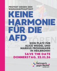 Deshalb rufen wir zu einer Kundgebung auf. Wir setzen ein deutliches Zeichen: Heilbronn ist kein Ort für Hetze und Ausgrenzung. Wir stehen zusammen für Menschenwürde, Zusammenhalt und eine Politik, die die tatsächlichen Probleme ernst nimmt.