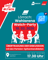 Vor der Landtagswahl will der DGB wissen, wie die Spitzenkandidat*innen der Parteien zu den Forderungen der Gewerkschaften stehen. Wir schauen uns die Wahlarena online gemeinsam vor Ort an und diskutieren darüber. Sei live dabei!