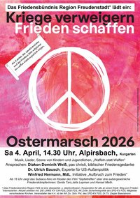 Wie schon im letzten Jahr findet unsere diesjährige Ostermarschkundgebung im schönen Kurgarten beim Kloster Alpirsbach statt. Der Begriff "Marsch" bezieht sich in unserer ländlichen Region auf die Anreise (Bahnankunft aus FDS 14.16 Uhr, aus Schiltach 13.38 Uhr, Bus 13.48 Uhr). Sah es mit dem Ukrainekrieg und den enormen deutschen Aufrüstungsplänen der letzten Jahre schon äußerst bedrohlich aus, so erleben wir nun eine weitere Steigerung durch die den Weltfrieden gefährdenden und viele Menschen in den Tod reißenden Angriffskriege der USA und Israels. Dieser Kriegsrealität wollen wir uns mit Friedensmusik (Tobias Steeg – Alphorn, Trompete usw. und Co sowie Theodor Ziegler, Gitarre und Mundharmonika), mit einer Szene von Kindern und Jugendlichen (teils mit migrantischem Hintergrund) anhand Erich Kästners „Konferenz der Tiere“ entgegenstellen und uns ermutigen, trotz allem auf dem Weg des Friedens zu bleiben. Als Redner konnten wir dieses Jahr Diakon Dominik Weiß, pax-christi, Baiersbronn und Dr. Ulrich Bausch, Reutlingen, Mitglied der SPD-Initiative „Mehr Diplomatie wagen“ sowie Minister Winfried Hermann, MdL B90/Grüne, Rottenburg, gewinnen – beide sprechen als Vertreter der württembergischen Initiative „Aufbruch zum Frieden“.