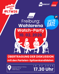 Bei der DGB Wahlarena werden die Spitzendkandidaten der Parteien im Stuttgarter Willi-Bleicher-Haus über die Themen der LTW debattieren. Hier in Freiburg werden wir den Abend streamen. Vor Ort wird im Anschluss noch Raum für Zuschauerfragen und Diskussion geben. Im Anschluss laden wir zu einem entspannten Zusammenkommen und Austausch ein.
