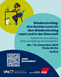 Die ersten Monate mit deinem Kind sind vorüber und du machst dir Gedanken über deine Rückkehr in den Betrieb, in dem du vor deiner Elternzeit gearbeitet hast. Mit dem Workshop erfährst du, welche gesetzlichen Ansprüche du bei der Rückkehr in den Betrieb hast. Wie du z.B. Teilzeit geschickt nutzen kannst, um dein Recht auf Vollzeit zu erhalten. Zudem gelten in vielen Betrieben gewerkschaftliche Regelungen, die dir bei der Vereinbarung von Familie und Beruf helfen. Einige davon werden in dem Workshop vorgestellt.