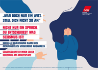 Zum Internationalen Tag gegen Gewalt an Frauen 2025 setzt die DGB Region Stuttgart den Fokus auf Sexismus am Arbeitsplatz. Mit einer Plakatreihe wollen wir für das Thema sensibilisieren und mit der Handlungshilfe „Sexualisierte Belästigung am Arbeitsplatz verhindern!“ den betrieblichen Aktiven einen Leitfaden überreichen, um gegen Sexismus am Arbeitsplatz aktiv zu werden.